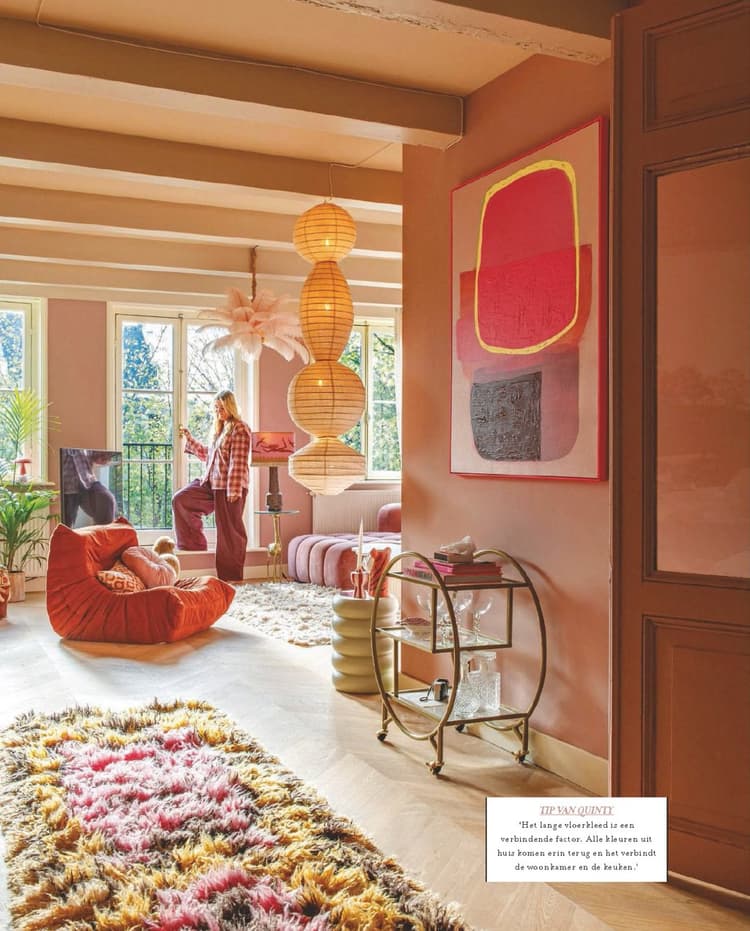 ‘Het lange vloerkleed is een verbindende factor. Alle kleuren uit huis komen erin terug en het verbindt de woonkamer en de keuken.’