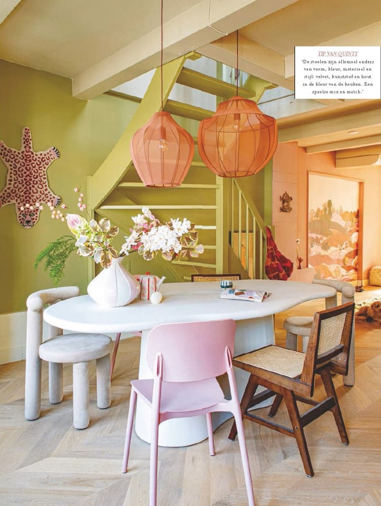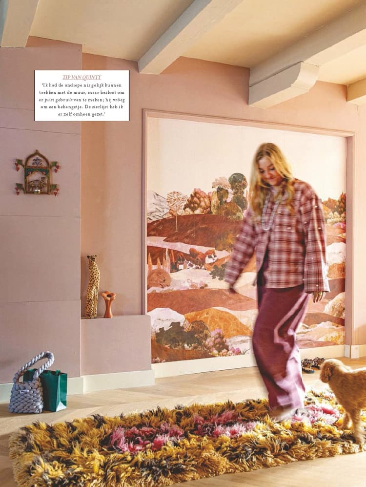 Belangrijk voor Quinty zijn de persoonlijke spullen en ‘leuke dingetjes’ vol herinneringen en verhalen. Souvenirs, haar eerste designerstas, (‘een Chanel’), een platenspeler, een oude Vogue (‘ik ben gek op magazines’). ‘Ik bracht ze een beetje gecureerd samen in mijn decoratiekast, de main focus in de zithoek. Deze spullen, het huis, ze vertellen wie ik ben: een kleurrijk, creatief, vrolijk persoon bij wie iedereen welkom is. Dat je iets mag maken dat zó jou is, vind ik superwaardevol.’