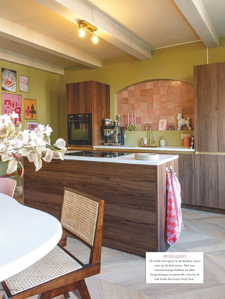‘Ik wilde wel tegels in de keuken, maar niet op de hele muur. Met een voorzetwandje hebben we deze boogvormige nis gemaakt, waarin ik ook leuke decoratie kwijt kan.’