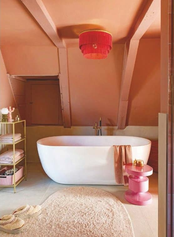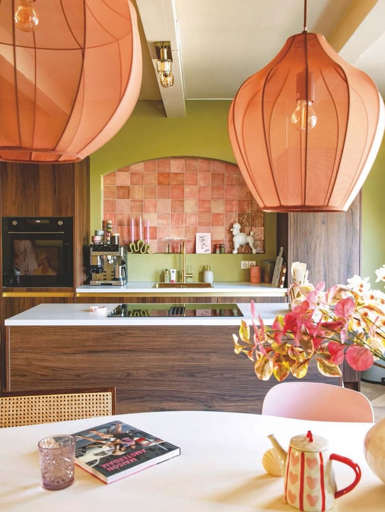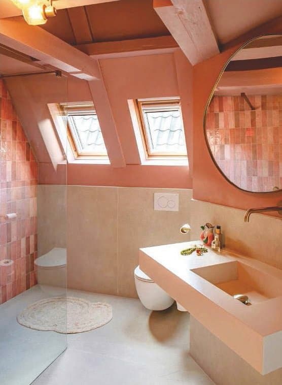 Over het kleurpalet hoefde Quinty, die als freelance content creator verantwoordelijk is voor de socials van onder andere stylist Roos Reedijk, niet lang na te denken: dat werd roze, roze en roze. ‘Overal dezelfde tint. En olijfgroen in de keuken om het palet een beetje aan te vullen. Ik vind roze een fijne kleur om mee te werken. Het omhelst je als een deken. En je zou het misschien niet denken, maar het combineert met bijna iedere andere kleur.’ Het lage slaapkamerplafond verfde ze mee. ‘Als een soort warm omhulsel, en omdat het logisch voelt om vanuit de schuine wanden dóór te verven.’ Beneden kleuren de eeuwenoude balkenplafonds en het meeste houtwerk warm beige. ‘Knal op de muren, rust erboven.’ Op de vloer ligt een klassieke Hongaarse punt in eiken, die mooi contrasteert met de keuken, uitgevoerd in donker walnoot: ‘Dat past altijd, bij alle kleuren.’