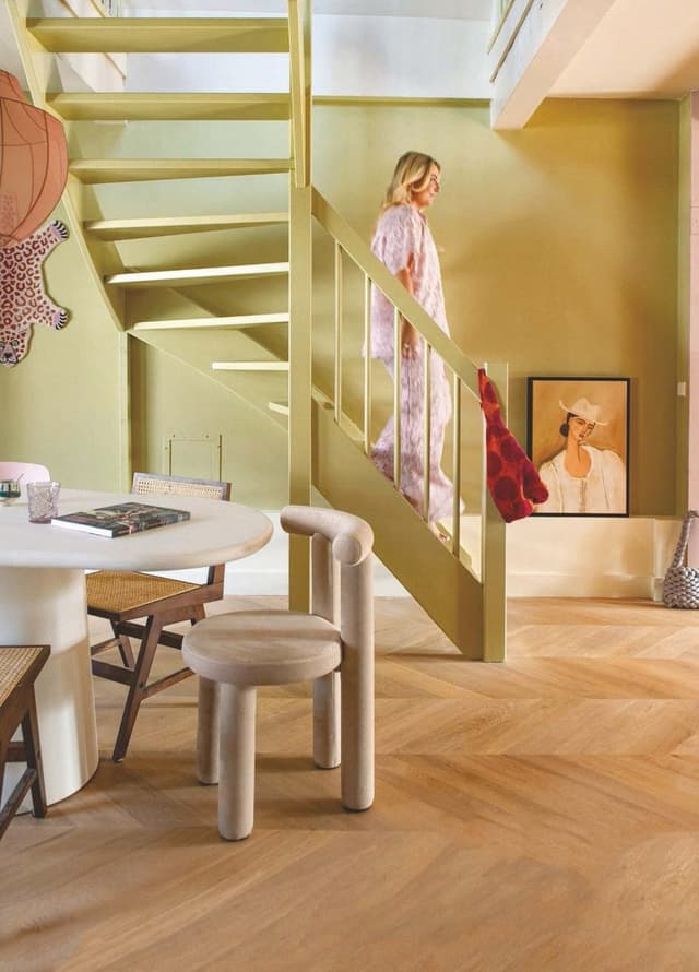‘Om lucht in de ruimte te houden, heb ik gekozen voor een open trap. Door hem mee te verven met de wand, valt hij er mooi mee samen.’