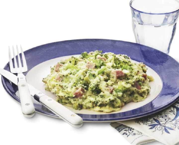 Breng twee pannen met water en een beetje zout aan de kook. Schil en snijd de aardappels in gelijke stukken. Kook de aardappels in circa 15 minuten gaar. Giet af en stoom ze droog. Pureer de aardappels met een pureestamper. Maak de puree smeuïg met de crème fraîche en breng op smaak met versgemalen peper. Verwarm een pan en bak de spekblokjes in circa 5 minuten krokant. Snijd de champignons in vieren. Hak de noten grof. Voeg de champignons en noten toe aan de spekblokjes en bak circa 5 minuten mee. Voeg de honing toe aan de spekjesblokjes en verwarm op laag vuur circa 2 minuten. Verwijder de uiteindes van de snijbonen en snijd de snijbonen in schuine reepjes. Kook de snijbonen in circa 4 minuten beetgaar. Giet af. Roer de spekblokjes met champignons en de snijbonen door de puree. Eet smakelijk! <Bron: 24 Kitchen>