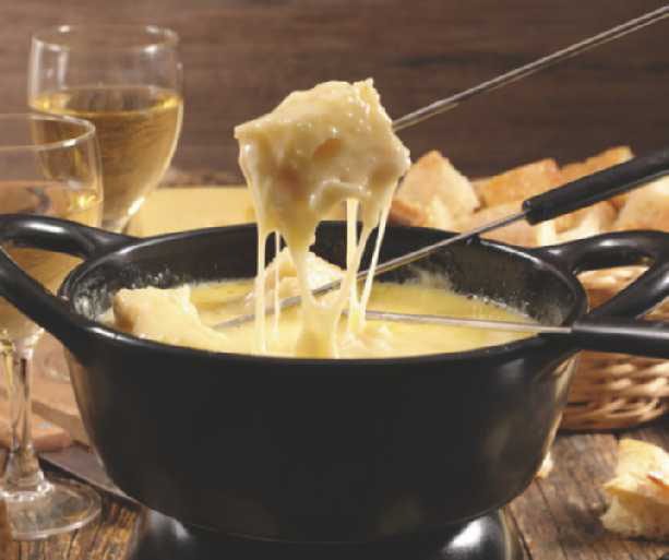 Rasp de twee soorten kaas. Halveer de knoflook en wrijf de kaasfonduepan ermee in. Schenk de wijn in de pan en verhit op middelhoog vuur. Voeg de kaas en het citroensap toe en laat al roerend rustig smelten. Meng de maizena met de kirsch, voeg al roerend toe aan de kaasfondue. Roer tot een samenhangend geheel. Breng op smaak met de nootmuskaat en peper.