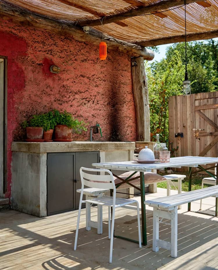 De betonnen buitenkeuken maakten Linda en Reinder zelf, alleen de stalen onderdelen werden door een lokale lasser in elkaar gezet. De tafel en banken zijn tweedehands, het stoeltje is van Ikea.