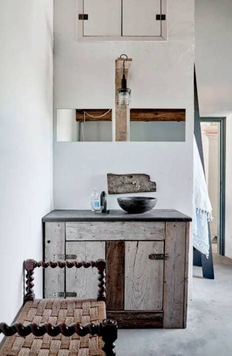 De wastafel in de badkamer is gemaakt van een oud, houten dienblad, dat voorheen werd gebruikt voor de fruitpluk.
