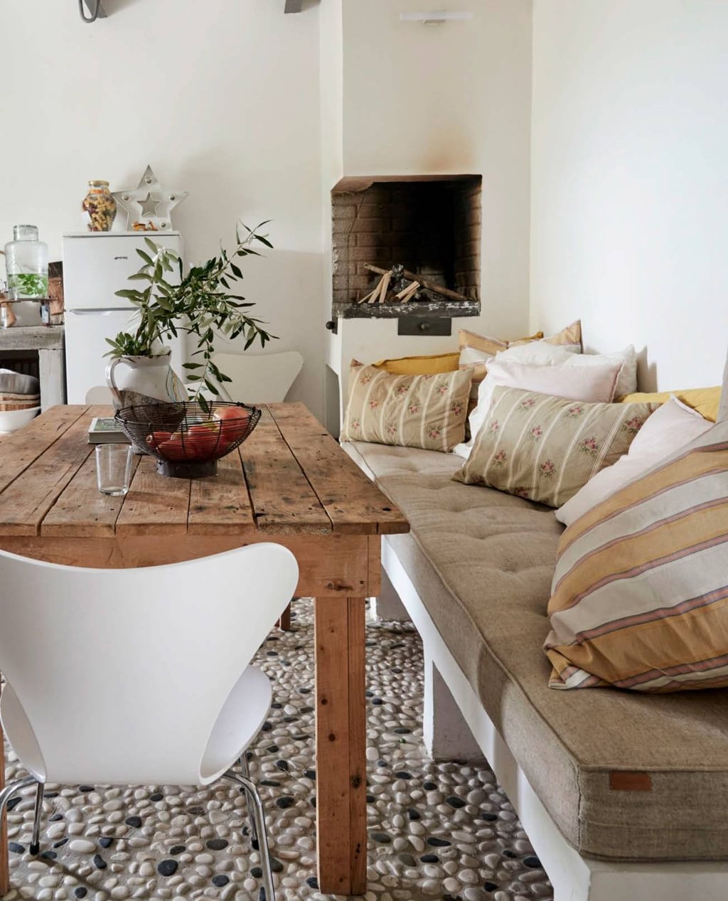 Linda en Reinder maakten de bank bij de tafel zelf. Je kunt dat eenvoudig doen met cellen-betonblokken en blokkenlijm. Op karwei.nl lees je hoe je te werk gaat. Zit de bank eenmaal in elkaar, dan kun je hem schilderen met latex. Een matraskussen en heel veel sierkussens erop en klaar! Zo’n matraskussen kun je op maat laten maken bij bijvoorbeeld maatkussens.nl.