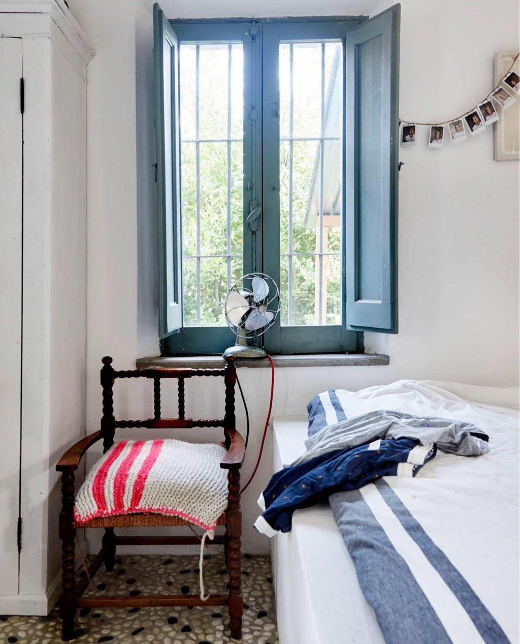 Het bed is zelfgemaakt. Erop beddengoed van Ikea. De stoel stond nog in het huis toen Linda en Reinder het kochten.