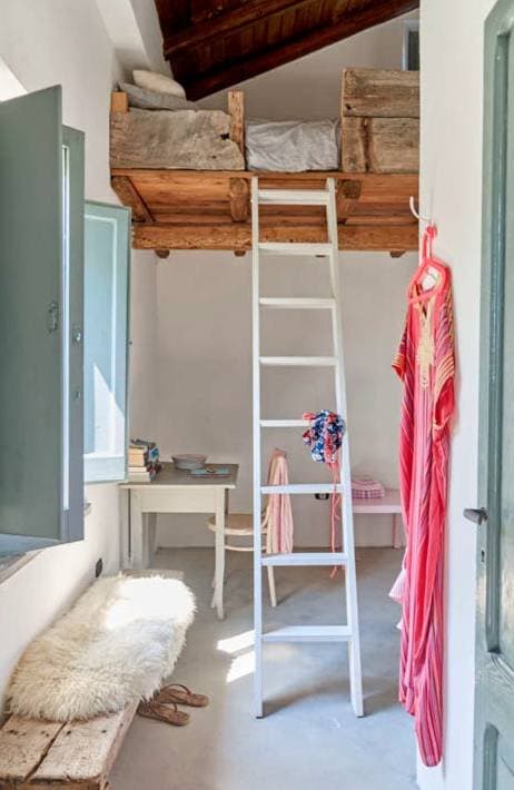 Elke slaapkamer kreeg een ‘loftbed’, zodat de kamer zelf zo ruimtelijk mogelijk bleef. Het oude houten bankje stond al in het huis.