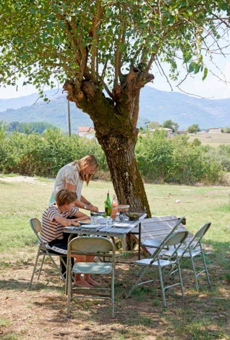 Een droomplek voor de lunch. Bij een buffelboerderij 500 meter verderop koopt Linda verse mozzarella.