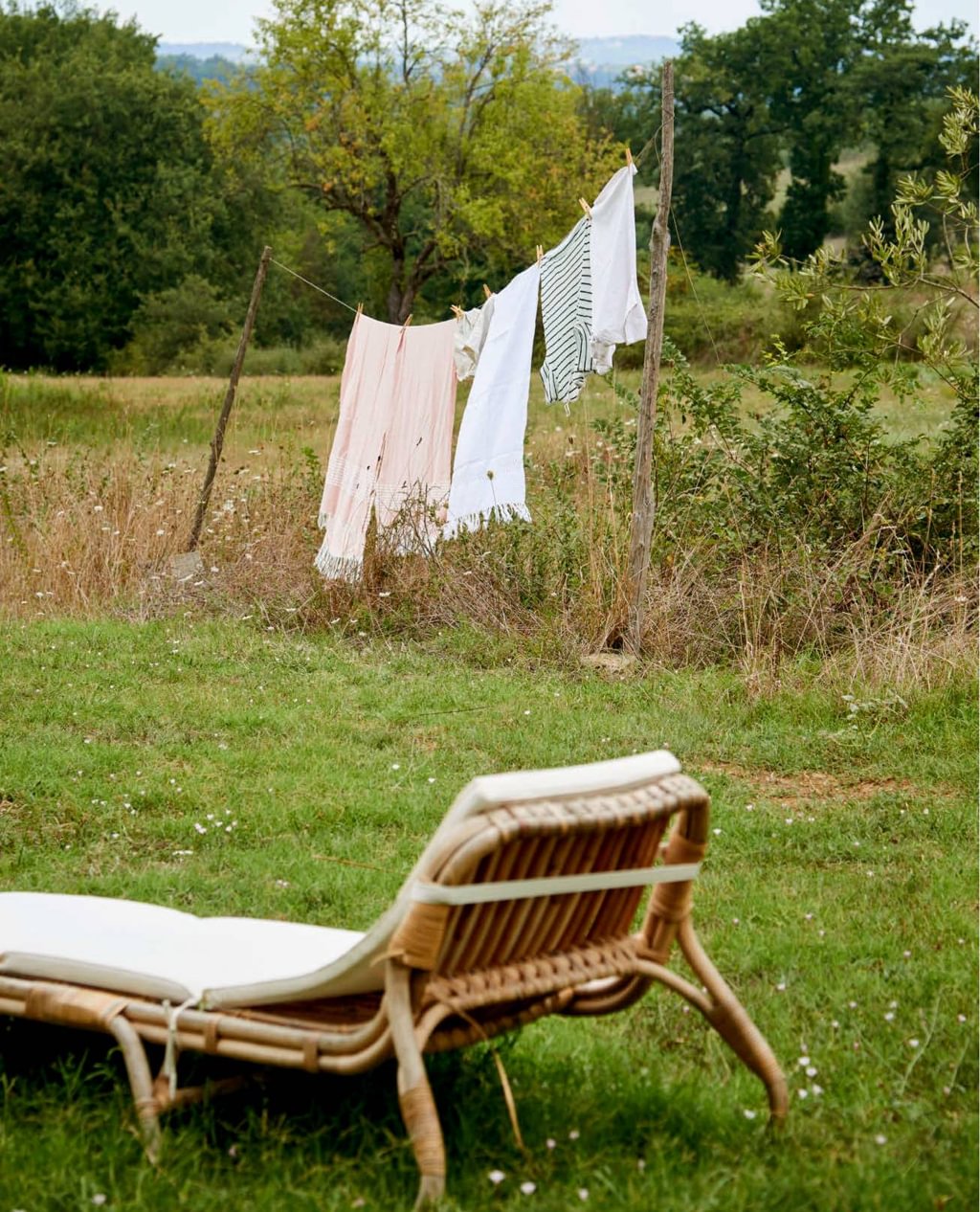 Wat idyllisch is, wil je idyllisch houden. Dus geen hypermoderne droogmolen in het hoge gras, maar ga op zoek naar een paar flinke takken. Graaf ze in de grond (stort desnoods was snelbeton in het gat voor extra stevigheid) en span een lijn tussen de stokken. Zo wordt het nog leuk om de was op te hangen. Tussen twee bomen kan natuurlijk ook, mits de bomen flink uit elkaar staan – natte was houdt van zon.